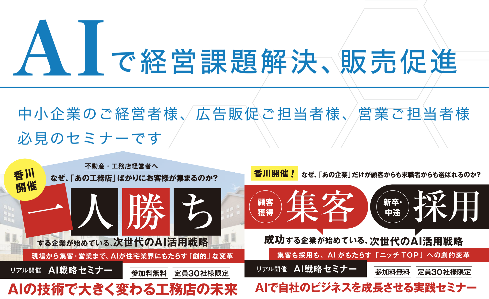 そこで本セミナーでは、単なるツールの紹介ではなく、現場の課題を即解決し、業績に直結させるための「本物のAI活用術」を公開いたします。今回は、業界特有の課題に特化した「住宅業向け」と、最新の経営ノウハウを凝縮した「全業種向け」の2つの講座をご用意しました。